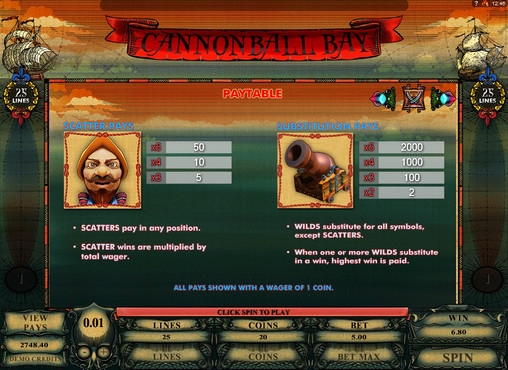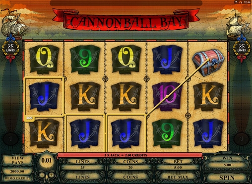 Видео-слот Cannonball Bay имеет двадцать пять линий и три ряда картинок, которые выстраиваются на экране, где вращаются пять барабанов.