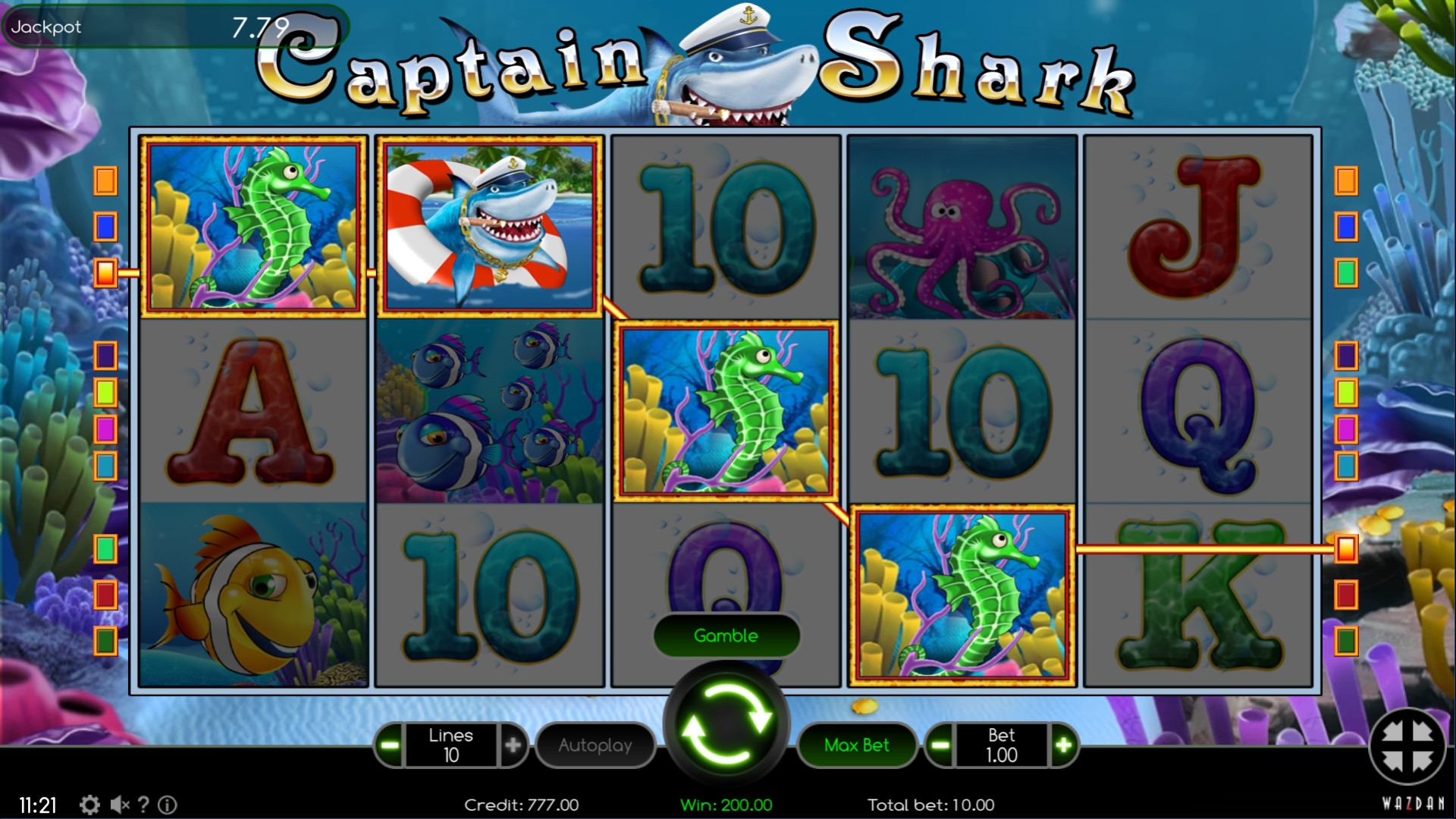 Пользователь может задействовать любое количество активных линий от одной до десяти. Ставки по ним будут равны. Можно ставить от одного цента до десяти долларов в каждом случае. Получается, что на раунд принимается даже всего один цент, а максимум достигает ста долларов. Но лучше уточнить диапазон в казино, где вы будете играть в Captain Shark на деньги.
