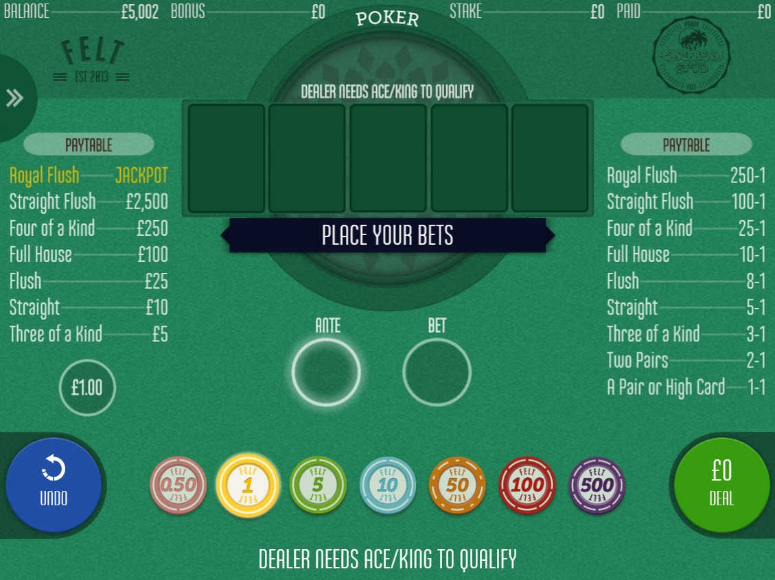 Одной из наиболее распространенных версий покера, в котором клиент играет против заведения, является карибский покер. На протяжении нескольких десятилетий он остается крайне востребованным в оффлайновых казино разных стран. Интернет-порталы азартной тематики тоже не оставляют его без внимания, а разработчики софта периодически выпускают новые модели. Одной из них посвящен данный обзор от Casinoz. Это Caribbean Stud с джекпотом от компании Felt Gaming, которая выпускает качественные игры с удобным интерфейсом, реалистичной графикой и интересными особенностями правил.