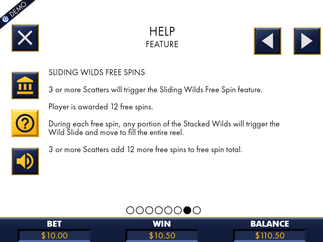 - Sliding Wilds Free Spins – Игрок получает право на участие в двенадцати фри-спинах, когда на экране появляются от трех скаттеров. Здесь он не рискует своими кредитами, потому что ставку за него делает казино. Ее размер и количество линий остаются неизменными с предыдущего раунда. Джокеры идут на барабанах вертикальными полосами. Если появляется даже всего один Wild, все цепочка смещается таким образом, чтобы заполнить колонку.