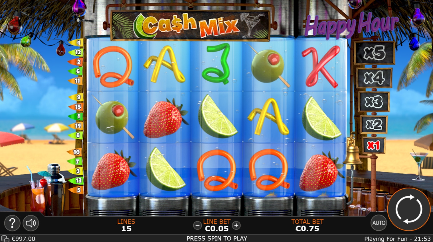 Игровой автомат Cash Mix состоит из пяти вращающихся барабанов. В колонках располагаются по три символа. Они выстраиваются в три ряда.