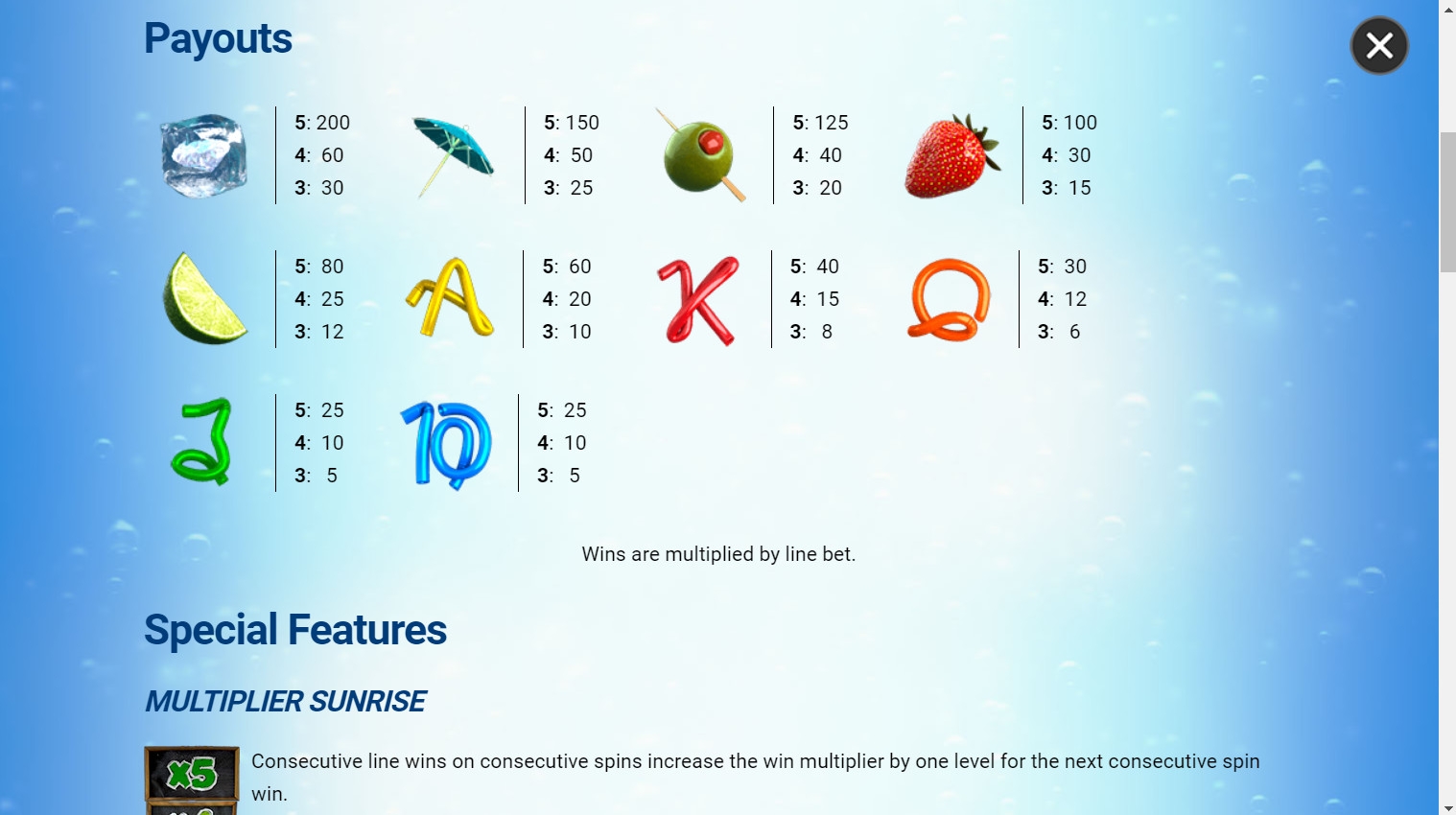 - Multiplier Sunrise – С каждым следующим выигрышным спином, идущим друг за другом, на единицу повышается множитель. Он может достигать х5.