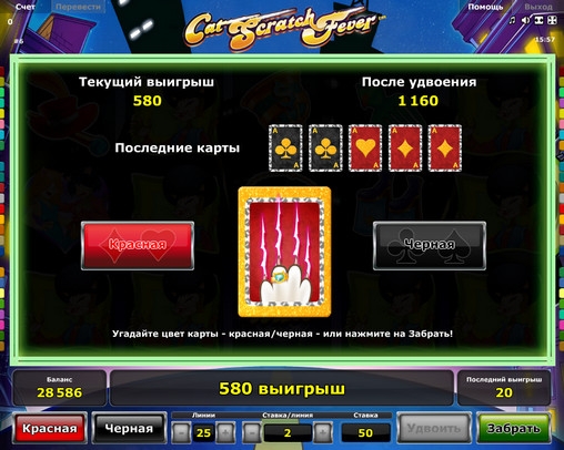 Общий выигрыш за раунд можно поставить на кон в игре по шансам видео-слота Cat Scratch Fever. В этом раунде, если вы решитесь принять в нем участие, нужно будет наугад назвать цвет закрытой карты. Правильный ответ означает, что выплата увеличится в два раза. Неправильный приводит к проигрышу денег. Подряд в одном раунде можно играть до тех пор, пока не будет достигнут лимит выигрыша. Он равен пятистам общим ставкам на спин.