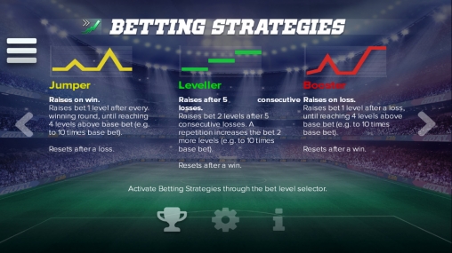 Стоит отметить наличие в Champion’s Goal возможности играть по системам ставок. Вы можете выбрать одну из трех стратегий, и программа сама будет менять сумму на кону в зависимости от ситуации.