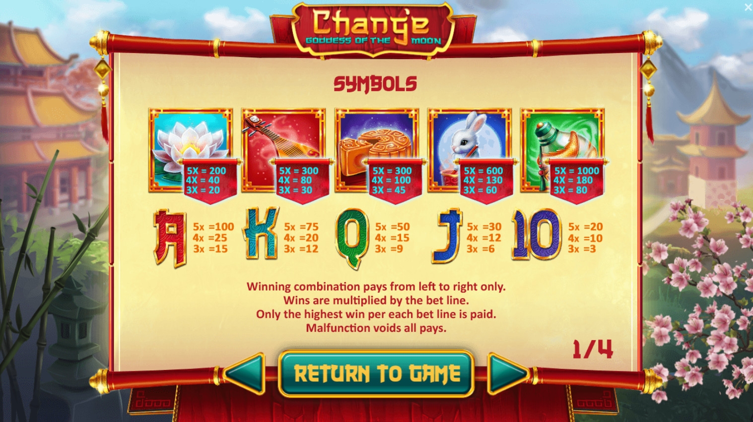 В колонках видео-слота выпадают разноцветные 10, J, Q, K и А, а также различные символы, тематически связанные с китайской легендой о богине Луны.