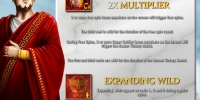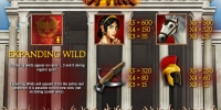 - Wild (штандарт с аббревиатурой SPQR) является расширяющимся джокером, представленным лишь на первом, третьем и пятом барабанах. Когда он выпадает в любой ячейке, он заполняет целиком колонку и помогает составлять цепочки из других изображений, кроме скаттеров.