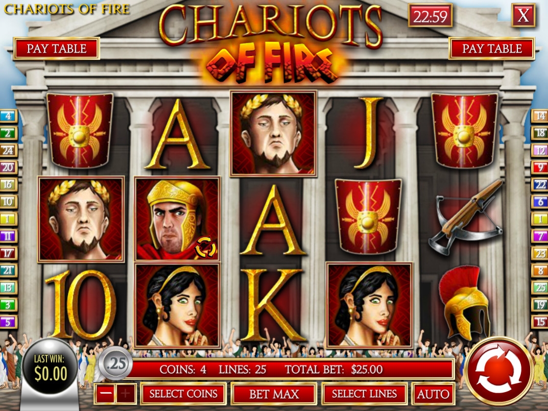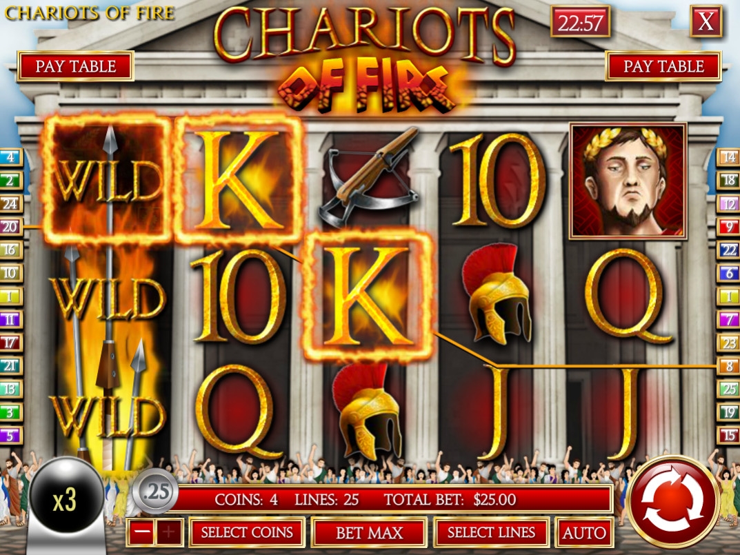 Видео-слот «Огненные колесницы» имеет пять барабанов и двадцать пять активных полос. Выбирать количество задействованных линий и размер ставки можно по своему усмотрению.