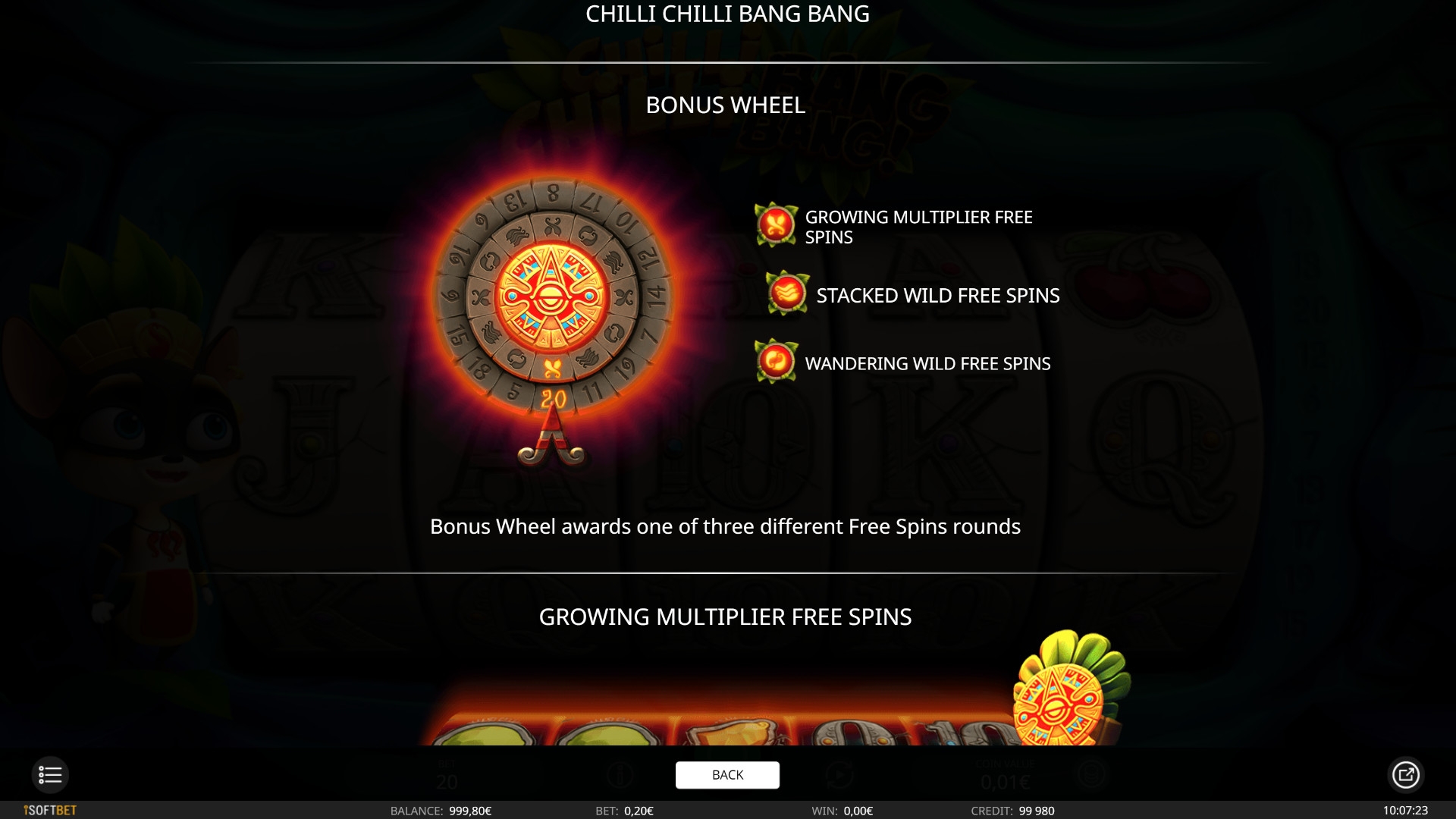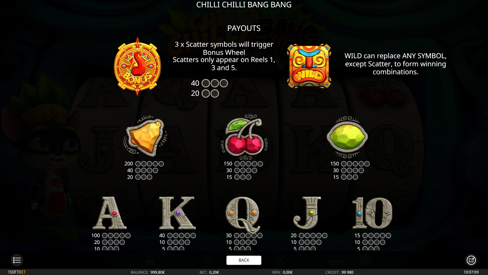 В игровом автомате Chilli Chilli Bang Bang пять барабанов, двадцать постоянно активных линий и пятнадцать ячеек для символов на главном экране.