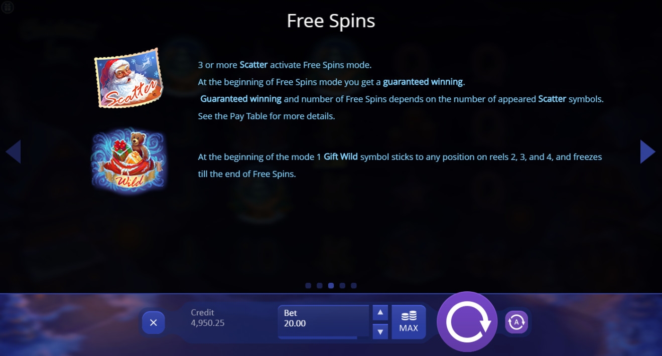 - Scatter (Санта Клаус) не привязан к расположению на экране и приносит выигрыши независимо от ячеек, в которых он выпадает. Рассчитываются они по общей ставке. От трех скаттеров начинают бесплатные вращения.