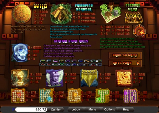 Картинки, нарисованные на барабанах автомата, соответствуют его тематике. Это различные золотые украшения, ритуальные предметы, хрустальный череп, а также собранные из каменных блоков номиналы игральных карт от десятки до туза.