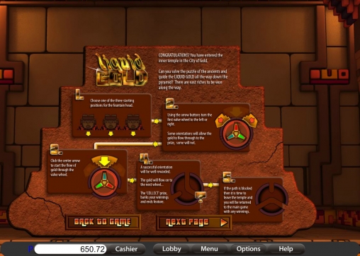 Призовой раунд видео-слота «Город из золота» называется Liquid Gold («Жидкое золото»). Это многоуровневая игра в виде головоломки. Правда, в ней все зависит от воли случая. На каждом из этапов вы будете наугад выбирать какие-то элементы, раскручивать колеса и выполнять прочие подобные действия. Чем дальше вам удастся забраться в лабиринте храма, тем крупнее окажется итоговая выплата. Диапазон возможных выигрышей зависит от ставки, по которой вы играли в спине, из которого попали в бонусный раунд.