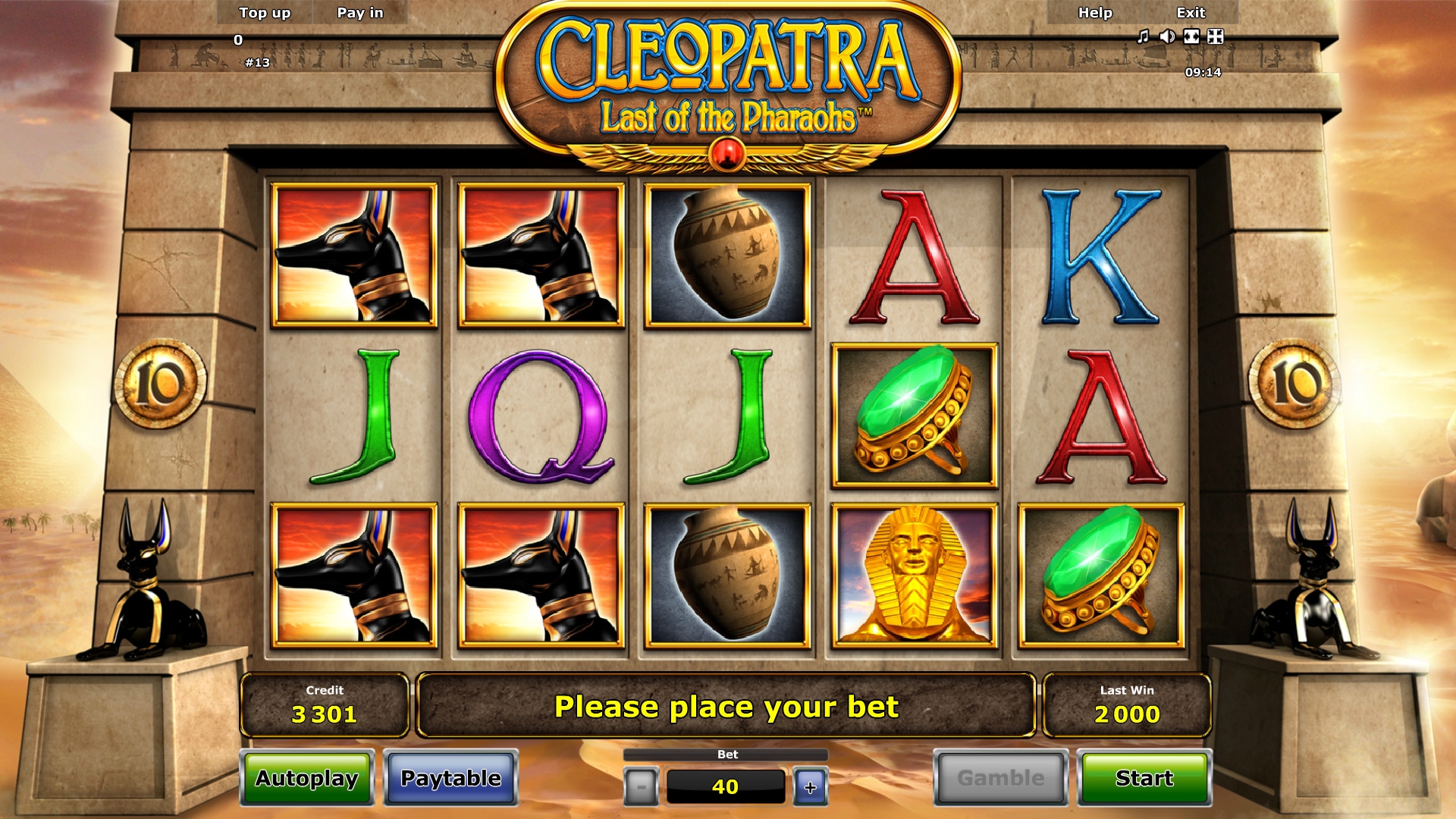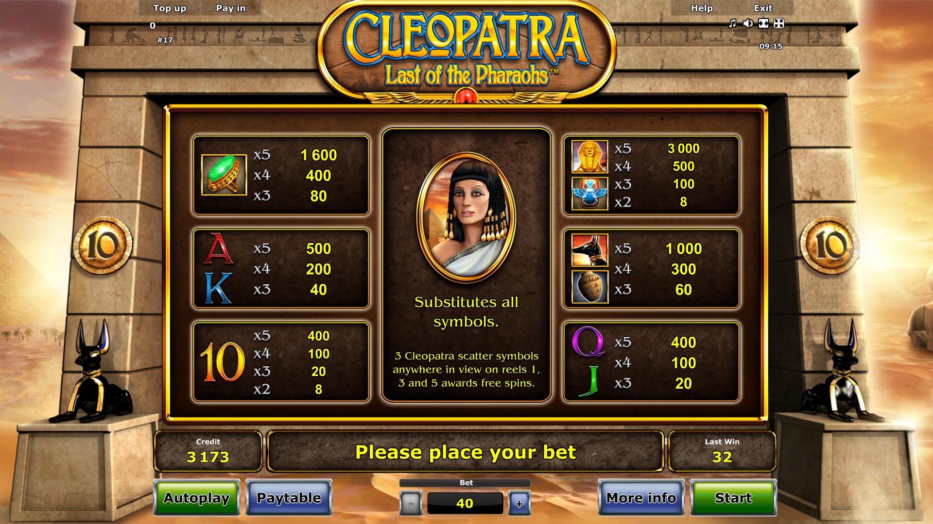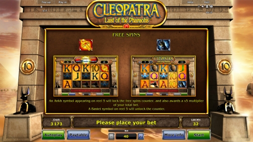 «Клеопатра: Последняя из фараонов» представляет собой виртуальную слот-машину с десятью постоянно задействованными линиями, пятью барабанами и пятнадцатью изображениями на основном экране.