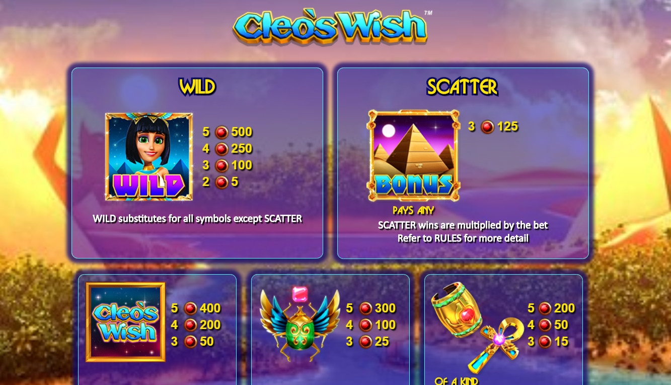 В игровом аппарате Cleo’s Wish пять барабанов, пятнадцать иконок на экране и двадцать пять фиксированных линий.