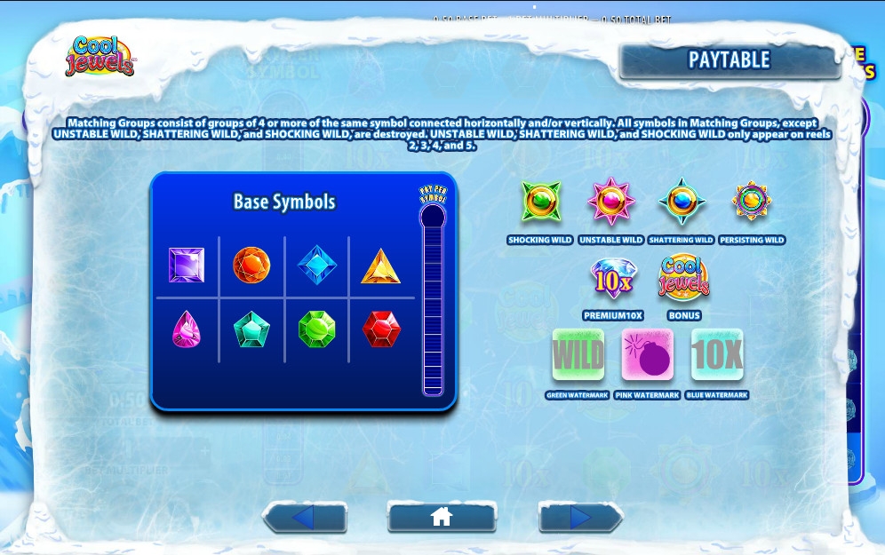 Wild (зеленая звезда), Unstable Wild (восьмиконечная розовая звезда), Shattering Wild (желтая звезда), Persisting Wild (восьмиконечная желтая звезда), Premium 10x (бриллиант), Bonus (логотип Cool Jewels), Green Watermark (полупрозрачная надпись Wild), Pink Watermark (полупрозрачное изображение бомбы с фитилем) и Blue Watermark (полупрозрачная надпись 10х).