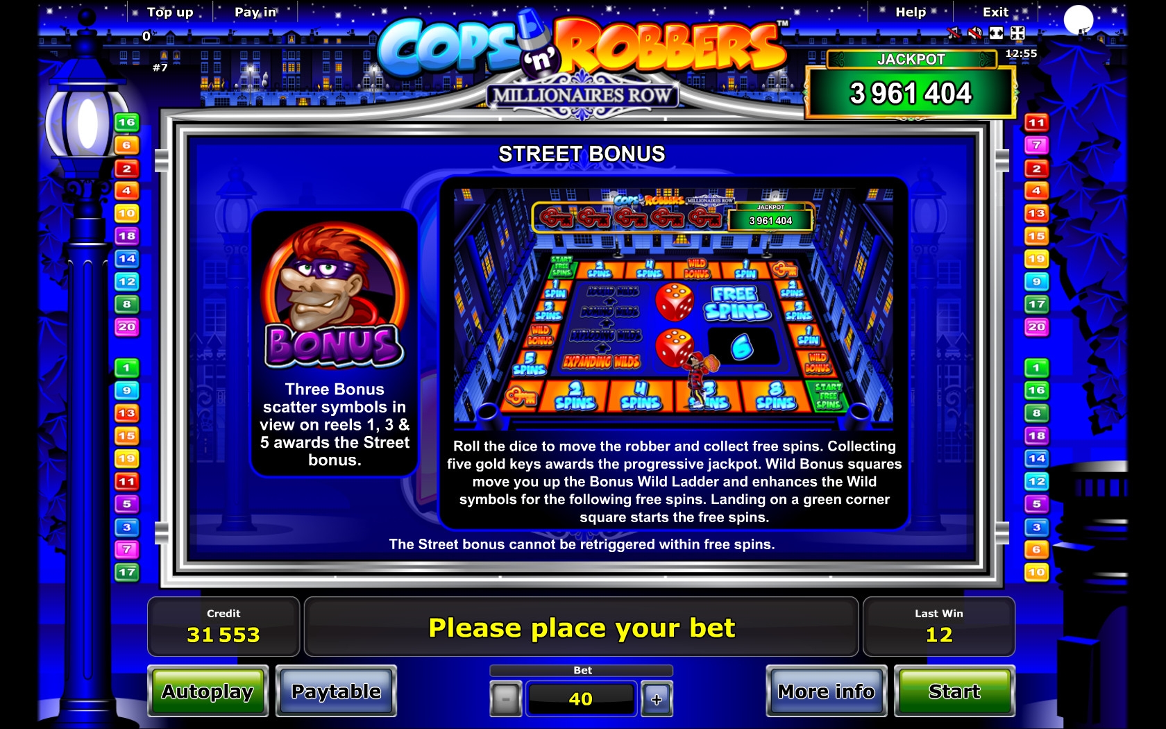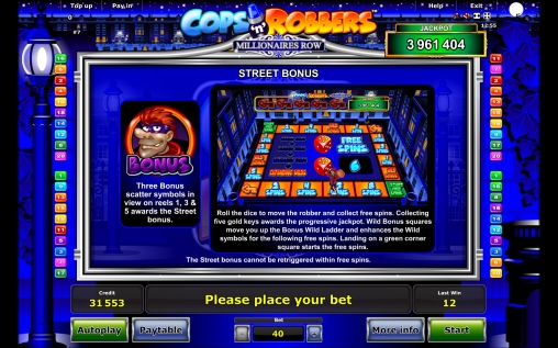 - Теперь рассмотрим особенности бонусной Street-игры, которую запускают три скаттера. Вы окажетесь на дополнительном экране, где нужно будет бросать кубик и перемещать грабителя на определенное количество шагов по специальной дорожке. Каждая его остановка будет приносить вам некоторое число фри-спинов или дополнительные бонусные опции. Когда персонаж остановится на одном из полей, запускающих бесплатные вращения, дальше он не пойдет, и начнутся призовые запуски барабанов. Ставка в них останется прежней.