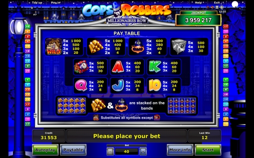 На экране Cops ‘n’ Robbers – Millionaires Row появляются картинки с изображениями полицейского, сейфа, слитков золота, взрывчатки, а также номиналов карт от десятки до туза. Слитки и копы идут на барабанах полосами и могут занимать всю колонку.