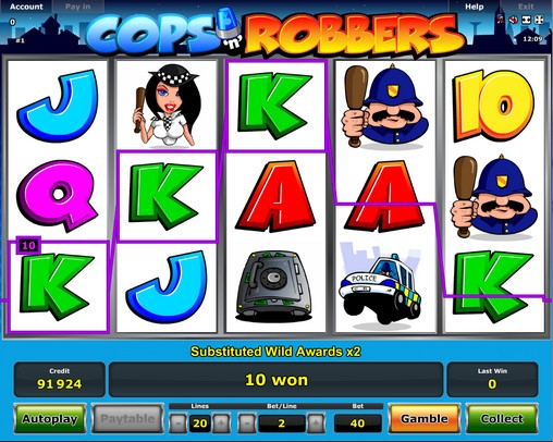 Играть на игровом автомате Cops ‘n’ Robbers можно по одной – двадцати активным линиям, поставив на каждую от двух до пятисот кредитов. На спин принимается до десяти тысяч кредитов.
