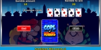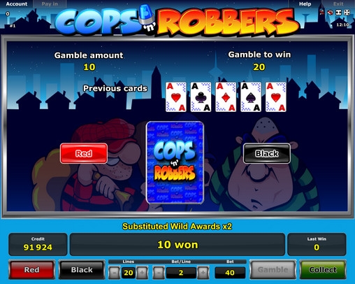 Общую выплату, которую игрок получает за спин, он может перевести на свой счет или же рискнуть нею в раунде на удвоение видео-слота Cops ‘n’ Robbers. Здесь нужно угадывать цвет карты, лежащей рубашкой вверх. Если ответ будет правильным, выигрыш удвоится. Если вы ошибетесь, ваша ставка уйдет в казино. Ошибаться нельзя. Разрешается играть в одном раунде, пока не будет достигнут максимум, но деньги можно забрать в любой момент.