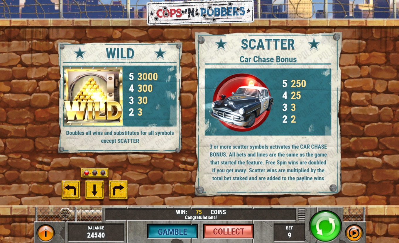 Перечень доступных в Cops ‘n’ Robbers функций состоит из базовых иконок, особых символов, риск-игры и фри-спинов с более выгодными правилами.