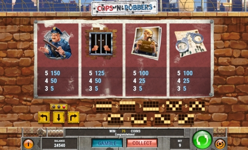 В слоте «Копы и грабители» пять барабанов и девять линий. Количество активных полос определяет клиент.