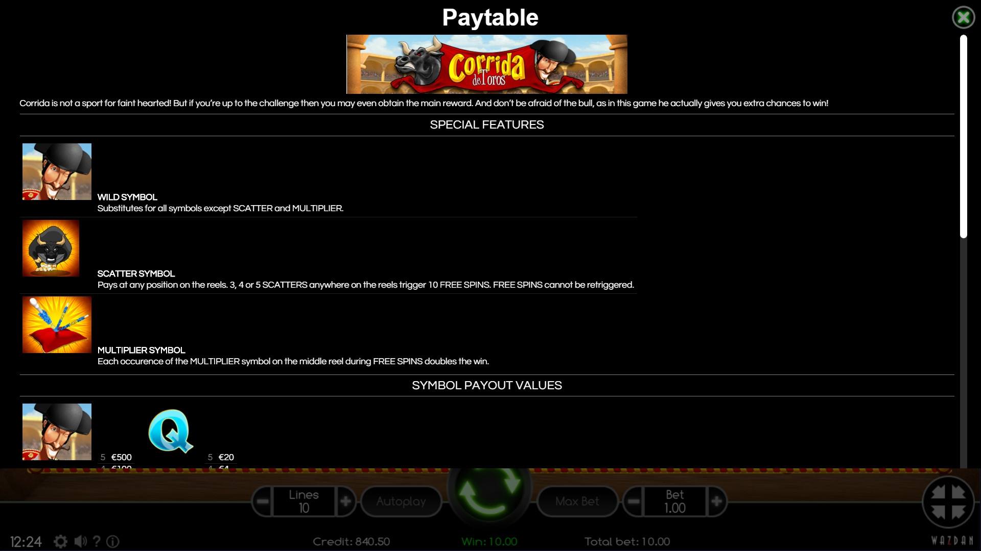 Corrida de Toros – видео-слот с пятью барабанами и десятью линиями, на экране которого появляются одновременно пятнадцать изображений тематических символов.