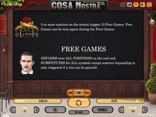 - Cosa Nostra Free Games – Начинаются десять раундов, проходящих на деньги заведения. Игра ведется по ставке из предыдущего запуска. Джокер становится расширяющимся и заполняет колонку, появляясь в любой ячейки. Фри-спины могут продлеваться неограниченное количество раз.