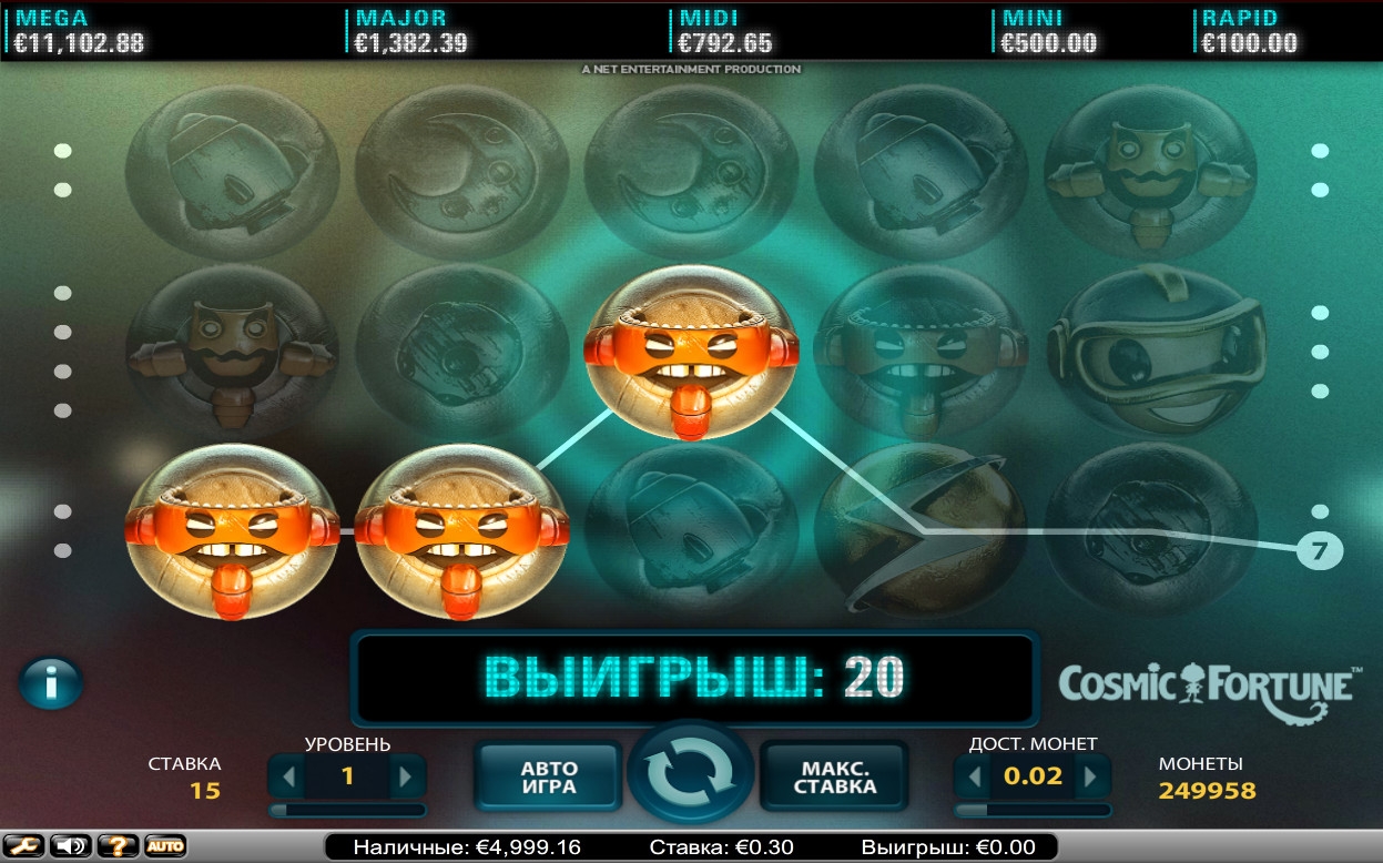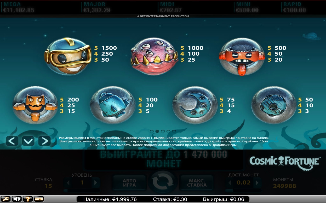Компания Net Entertainment не перестает радовать пользователей интернет-казино невероятными азартными играми с превосходной графикой и бесподобным геймплеем. Одной из таких новинок известного бренда стал бесплатный игровой автомат «Космическая фортуна», о котором мы расскажем читателям портала Casinoz в данном обзоре. Она подарит вам возможность совершить удивительное путешествие по необъятным просторам вселенной, которую населяют забавные существа. Вы будете участвовать в розыгрыше сразу пяти накопительных джекпотов и пользоваться многими другими опциями, рассматриваемыми ниже в статье.