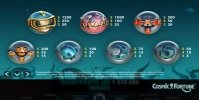 На барабанах игрового автомата Cosmic Fortune нарисован космонавт, инопланетяне, ракета, астероид и другие небесные тела и предметы.