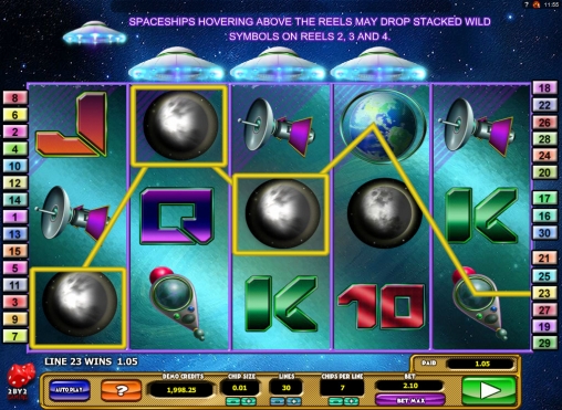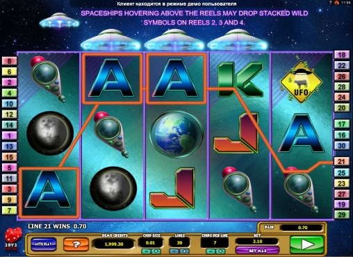 Кроме того, здесь действуют особые символы Wild (зеленый пришелец), Scatter (фиолетовый пришелец) и Bonus (знак НЛО). Они обладают особыми возможностями: