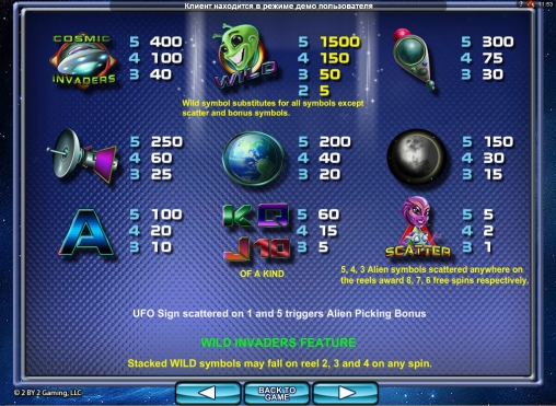 Cosmic Invaders – пятибарабанная модель с тремя рядами картинок на основном экране, тридцатью линиями, особыми символами, призовыми спинами, бонусными раундами и другими функциями. Игры по шансам нет.