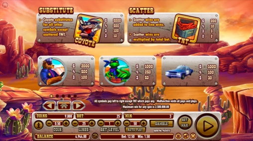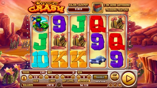 Игровой автомат «Крах койота» состоит из пяти вращающихся барабанов с картинками, образующими комбинации на двадцати пяти активных полосах. Символы располагаются на экране в три ряда.