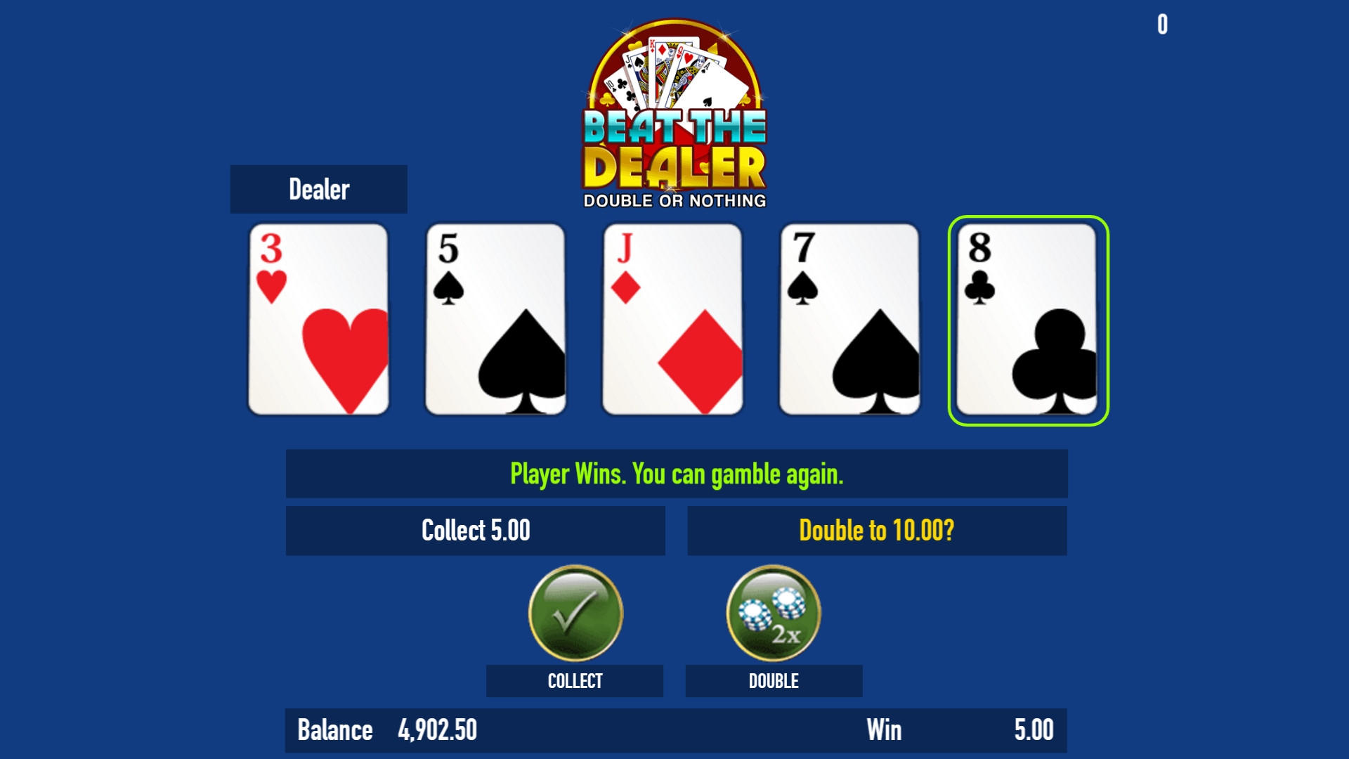 Игра на удвоение запускается по желанию клиента. Здесь нужно открыть наугад одну из предлагаемых карт. Она будет сравниваться с картой дилера. Если вы ее бьете, выплата удваивается. Если бьют вас, вы лишаетесь ставки. Возможна также ничья. Допускается несколько розыгрышей подряд.