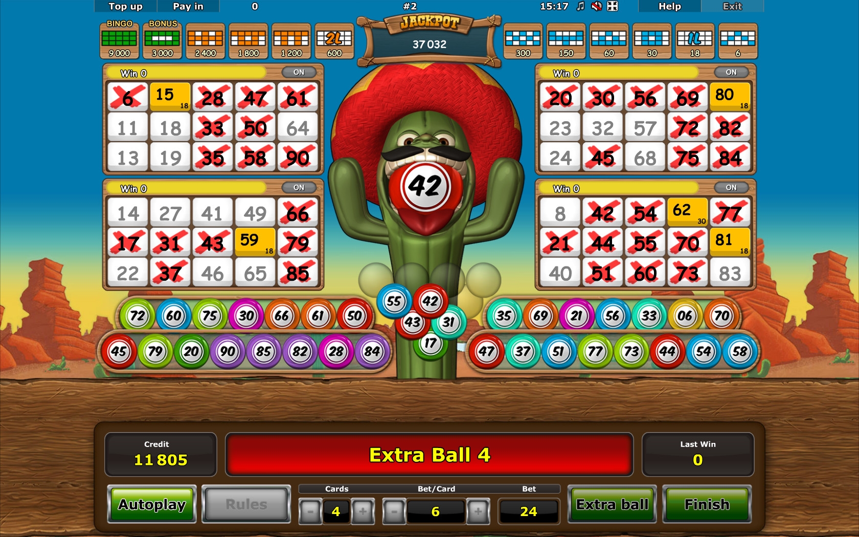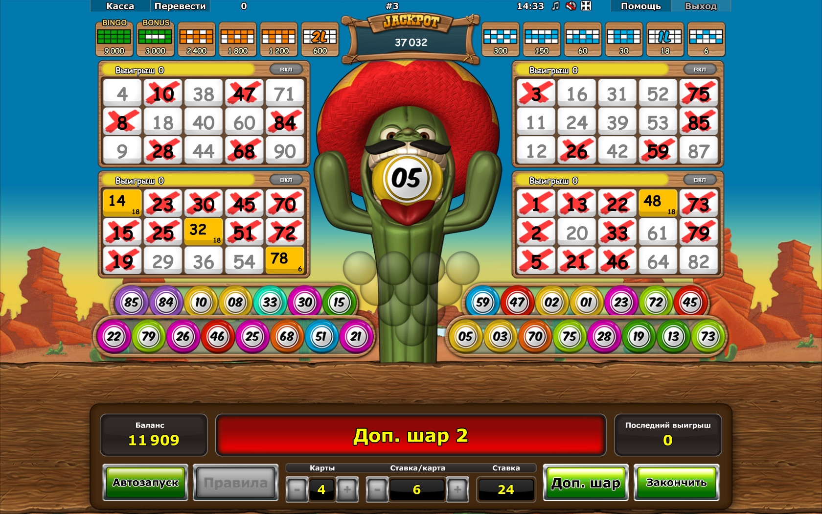 Розыгрыш прогрессивного джекпота в Crazy Cactus Bingo происходит по любой ставке. Но его сумма зависит от того, каким является номинал игровых билетов. Чтобы получить джекпот, нужно собрать максимальную комбинацию (Bingo, когда вычеркнуты все номера), задействовав не более тридцати шаров.