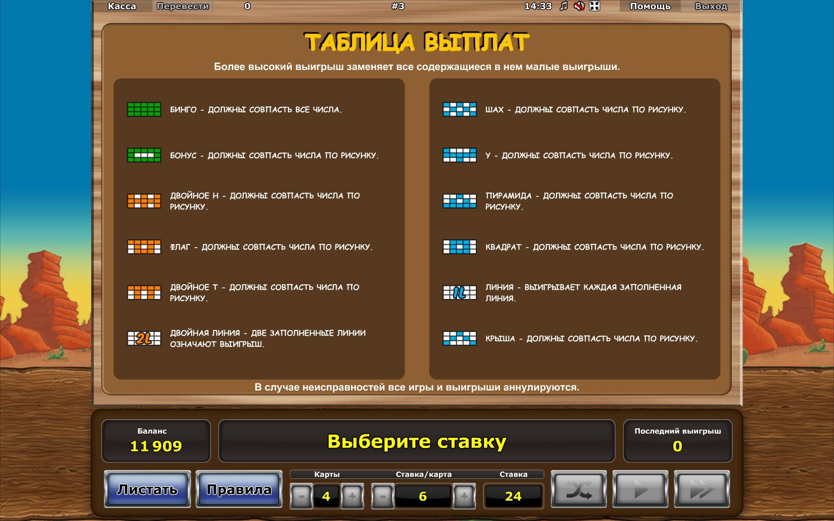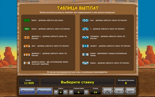 Выплаты начисляются по карточкам, в которых из вычеркнутых номеров образовались шаблоны, предусмотренные правилами. Мы не будем их описывать, потому что все комбинации подробно рассматриваются в правилах, а их схема есть даже на основном экране игры. Скажем лишь, что максимальной является Bingo (задействованные все номера), а второй по ценности является Bonus (двенадцать номеров по внешним позициям в карточке).