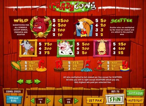 «Безумные коровы» имеет пять барабанов и три ряда картинок на основном экране. здесь пятнадцать активных линий. Вы можете играть на игровом автомате, задействовав любое их количество.