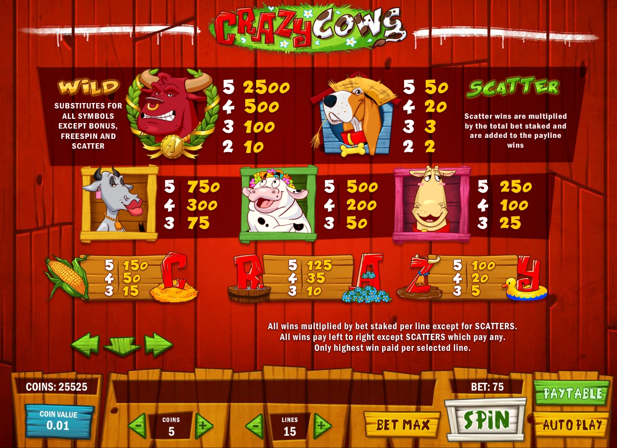 На барабанах игрового автомата вы увидите главных героинь игры – веселых коров, а также буквы C, R, A, Z и Y, выдержанные в стиле модели. Эти картинки являются базовыми и действуют по общим правилам.