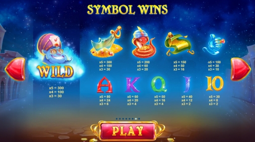 В столбцах видео-слота появляются разноцветные карточные номиналы, кулак джинна, ковер-самолет, кобра в чалме и меч на куче золотых монет. Одинаковые картинки могут следовать друг за другом в колонках.
