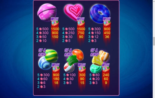 - Red Wild (красный леденец) выпадает в обычных спинах в третьей колонке. Он расширяется на весь столбец и заменяет все картинки, включая скаттеры. Участвуя в формировании комбинации, джокер утраивает базовые коэффициенты.