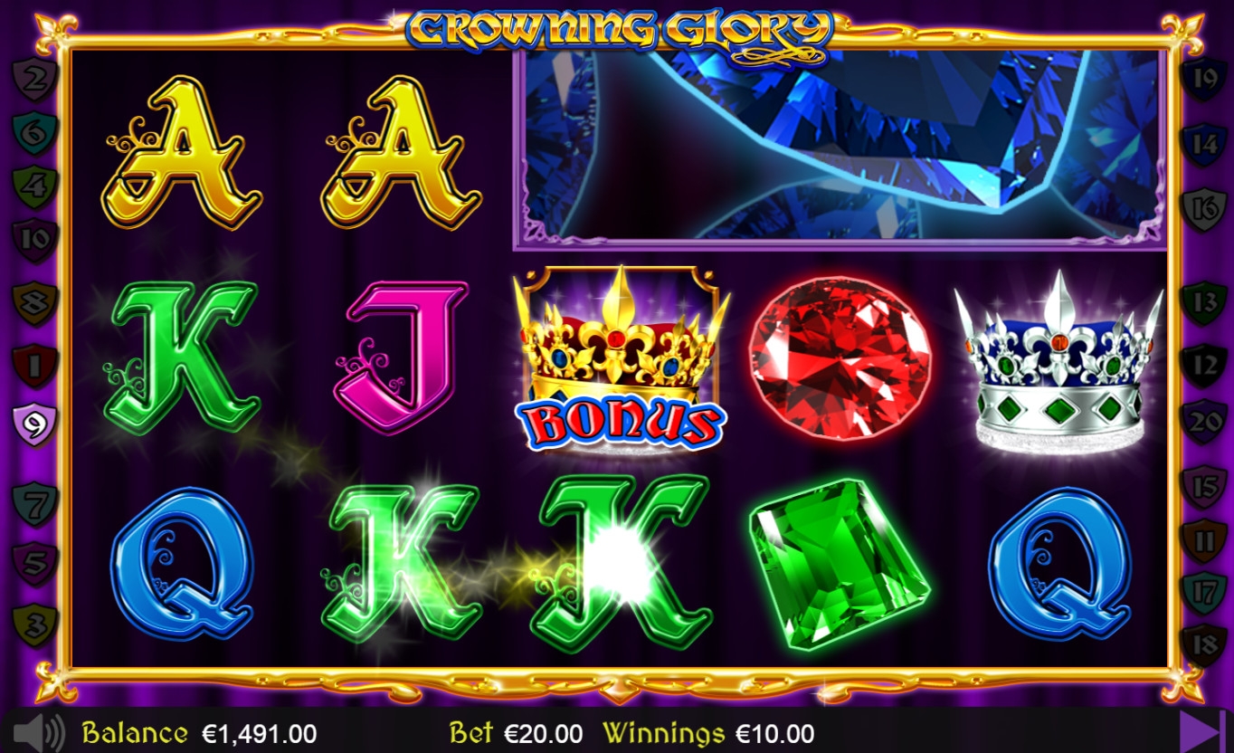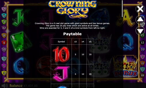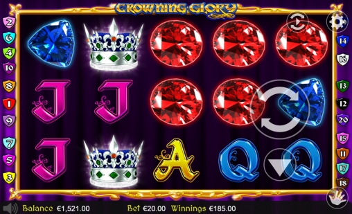Crowning Glory – видео-слот с пятью барабанами и двадцатью постоянно используемыми линиями. Иконки на основном экране выстраиваются в три ряда.