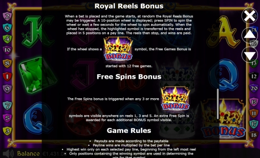 - Royal Reel Bonus может начаться в любом спине без дополнительных условий. Появляется колесо с десятью секторами, в которых изображены символы, используемые на барабанах. Раскрутив барабан, вы определите выигрышную картинку. Она перенесется на основной экран и составит на активной полосе цепочку из пяти элементов. По ней будет начислена выплата.