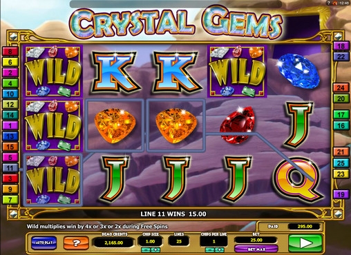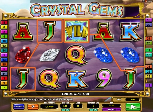 Crystal Gems – пятибарабанный видео-слот с двадцатью пятью линиями. Все они по умолчанию активированы, и нельзя изменить их количество. Символы на экране выстраиваются в три ряда.