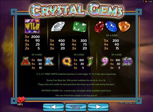 Под барабанами находится информационная строка, в которой появляются подсказки по игре. Скачивать игровой автомат Crystal Gems необязательно. Его можно запустить во флэш-режиме прямо на сайте казино. В Crystal Gems есть подробный справочный раздел с описанием всех особенностей модели.