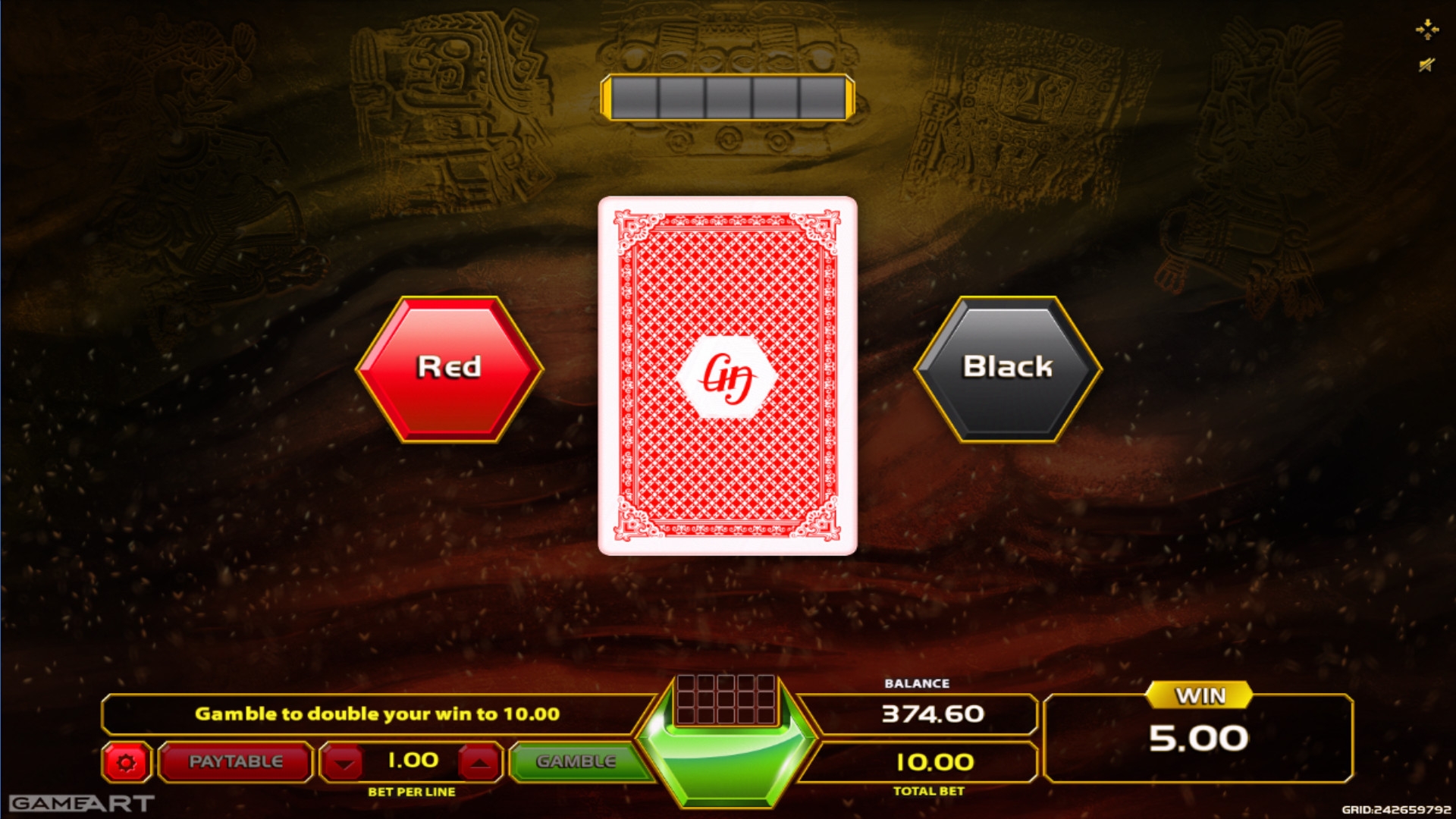 После остановки барабанов, если спин оказался выигрышным, можно начать раунд на удвоение выплаты. Здесь все просто: нужно угадывать цвет закрытой карты. Если повезет, сумма удвоится. Если нет, вы лишитесь ставки. Так можно играть несколько раз кряду.