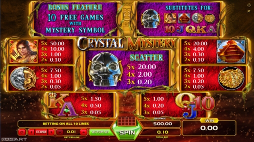 Crystal Mystery является 5-барабанным игровым автоматом с десятью постоянно задействованными линиями, на которых в процессе формируются оплачиваемые цепочки. Ставки по данным полосам неизменно равны. На каждую принимается 0.01, 0.02, 0.05, 0.10, 0.20, 0.50 или 1 доллар. Выходит, что диапазон ставок на раунд колеблется от десяти центов до десяти долларов.