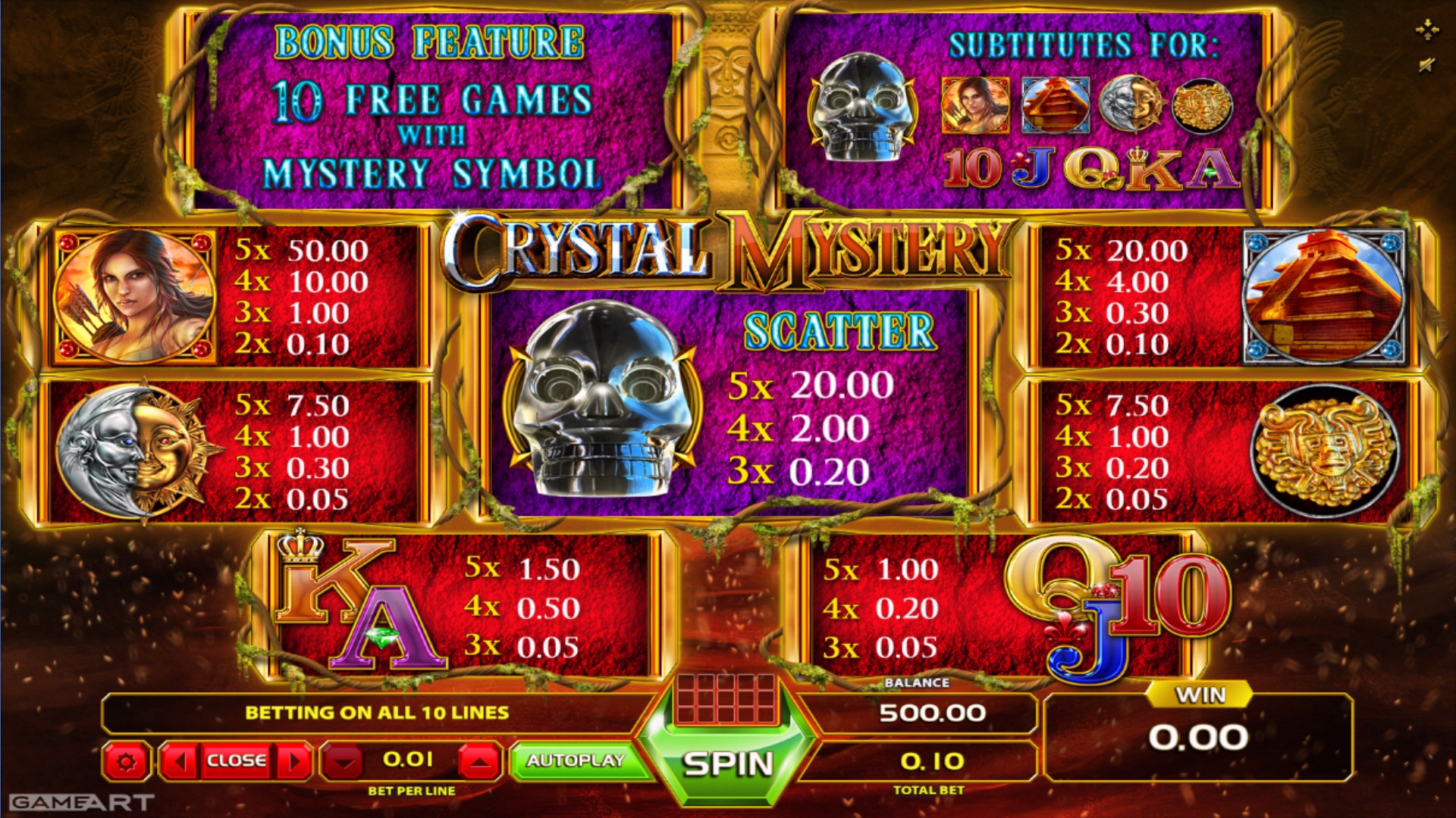 Хрустальная тайна это ярко оформленный видео-слот исторической тематики с бонусной игрой и без прогрессивного джек-пота, можно поиграть в тренировочном режиме без ставок.
