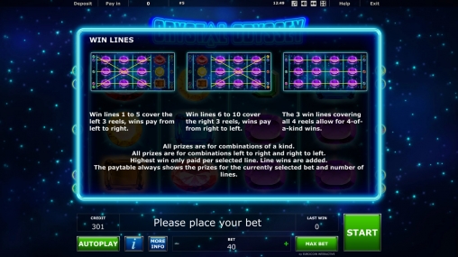 Для образования комбинаций предусмотрены пять линий, задействованных по умолчанию. Ставка на спин может быть от сорока единиц до одной тысячи.