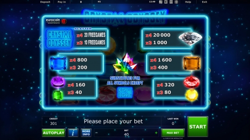 Базовые параметры дают возможность регулировать опции звука, экрана и геймплея. Скачивать автомат Crystal Odyssey не нужно.
