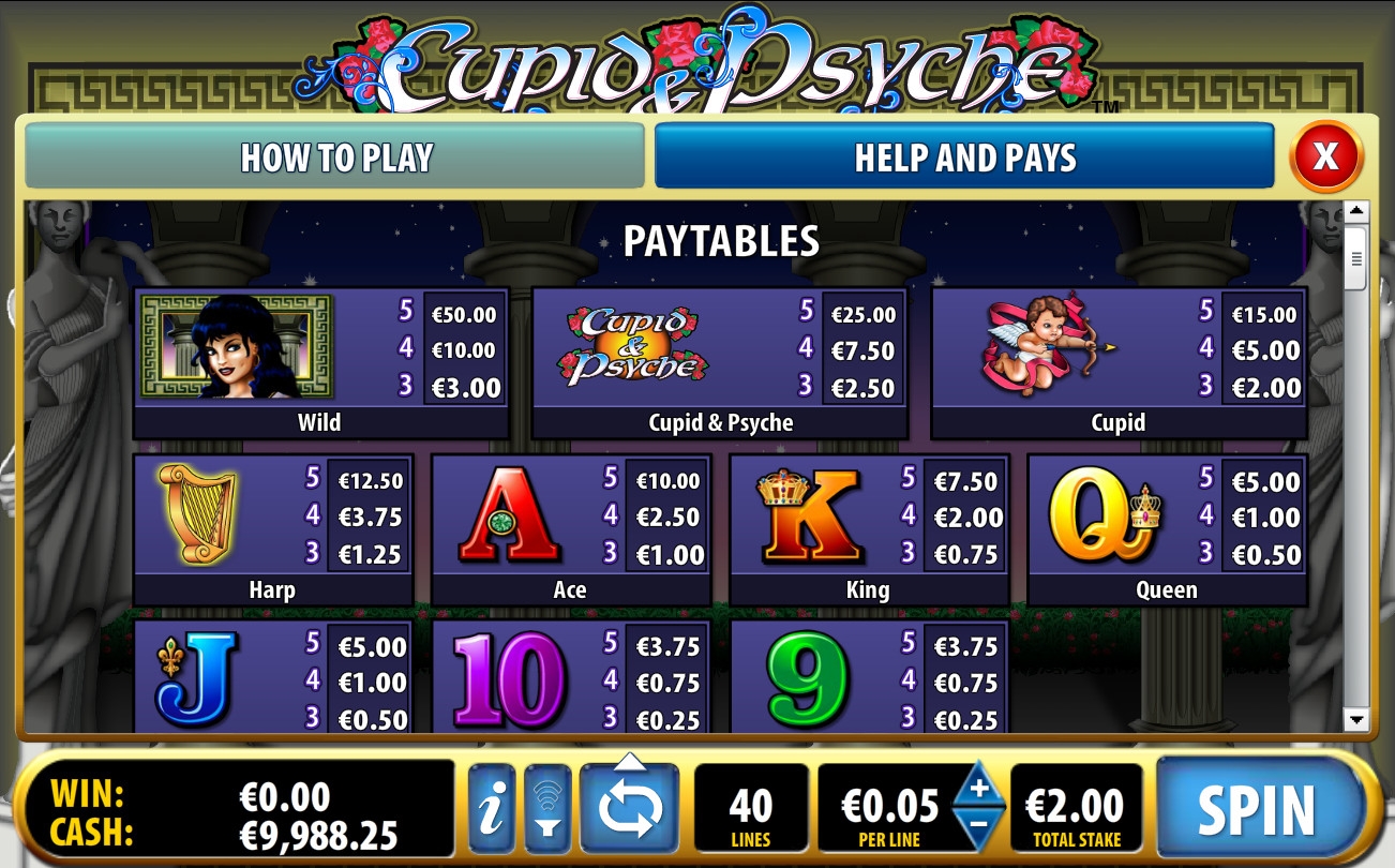 Cupid & Psyche – бесплатный игровой автомат с пятью барабанами, четырьмя рядами картинок и постоянно активными сорока линиями (их количество менять нельзя). В видео-слоте действуют особые картинки, призовые выплаты и другие опции.