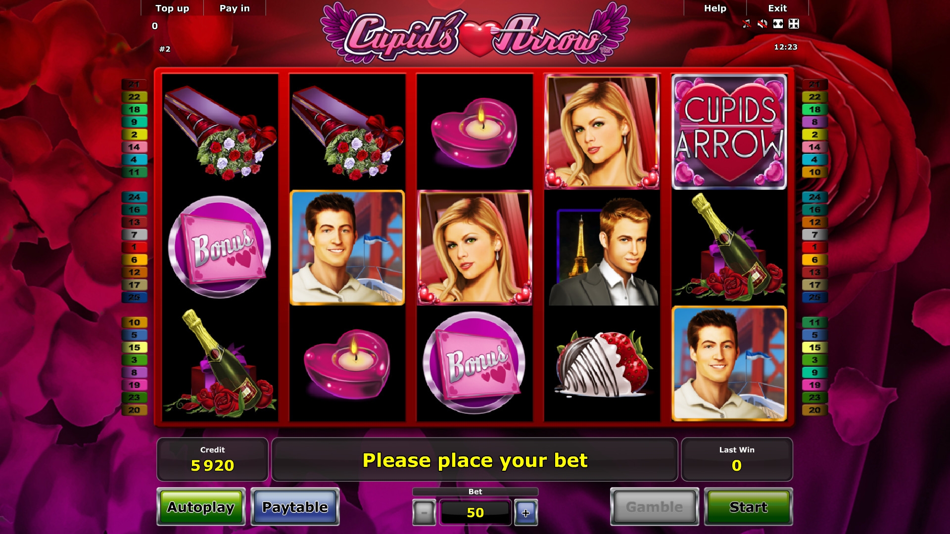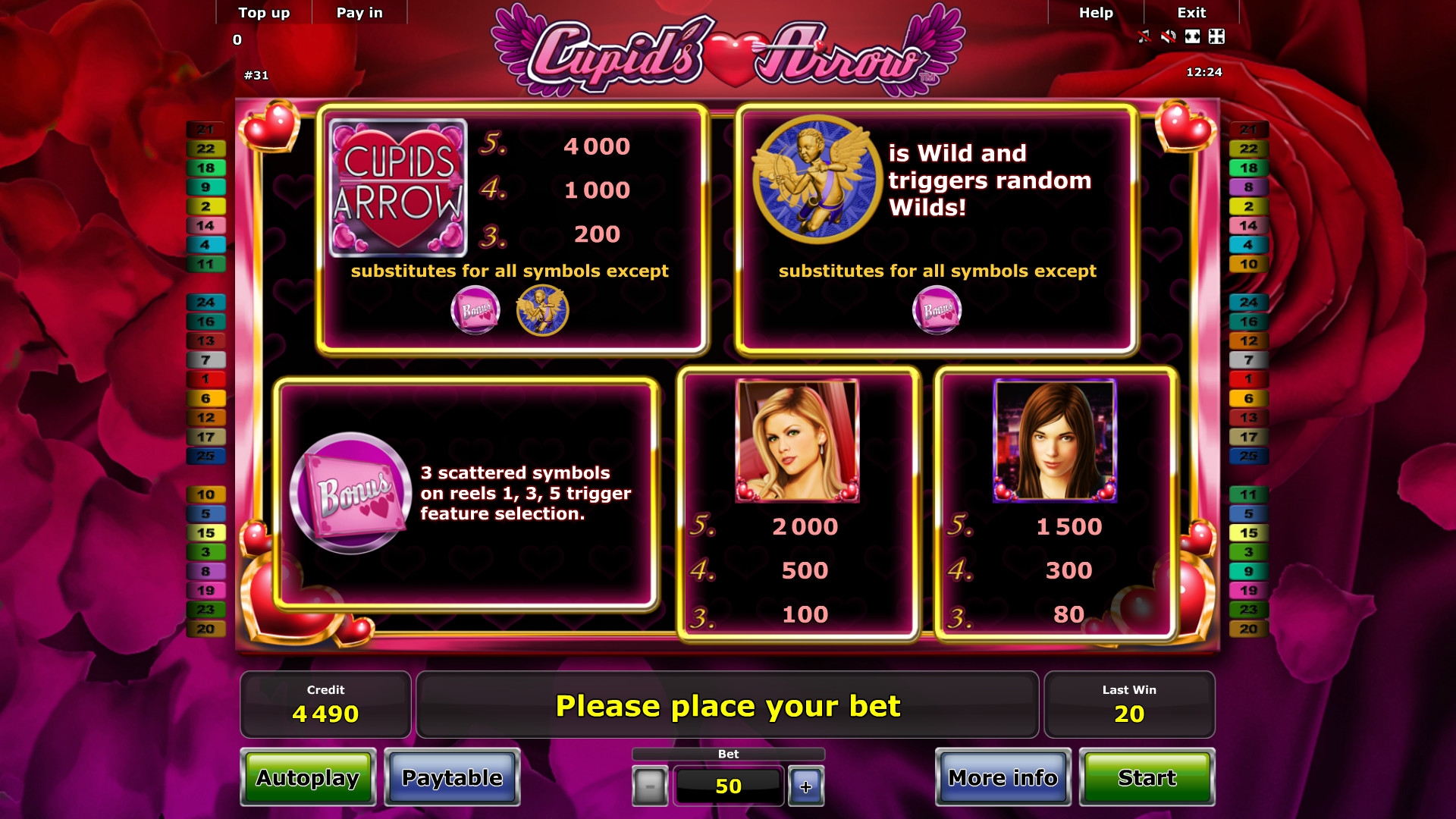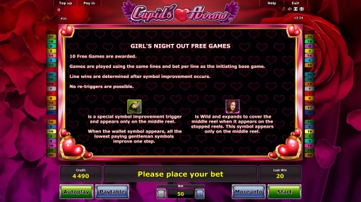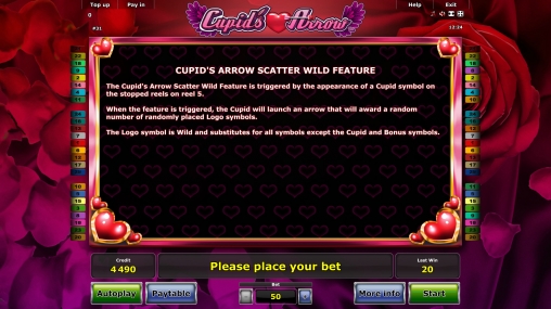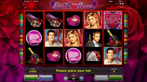 В Cupid’s Arrow пятнадцать картинок на главном экране. Барабанов – пять, а линий двадцать пять. При этом количество полос менять не разрешается. Как обычно, ставки по ним должны быть равны: от двух до четырехсот кредитов на каждую позицию. Диапазон сумм, принимаемых на спин, варьируется от пятидесяти единиц до десяти тысяч.