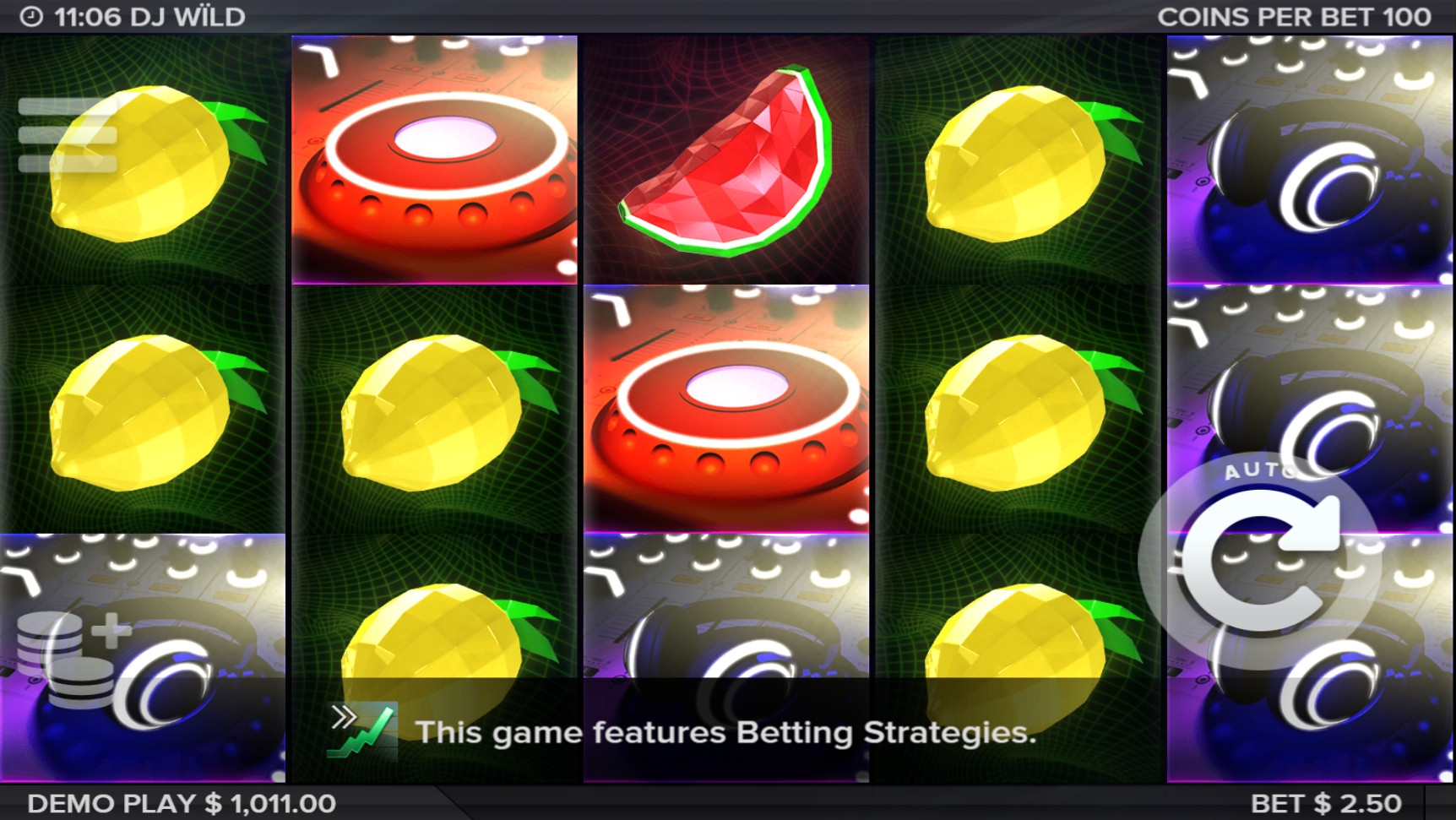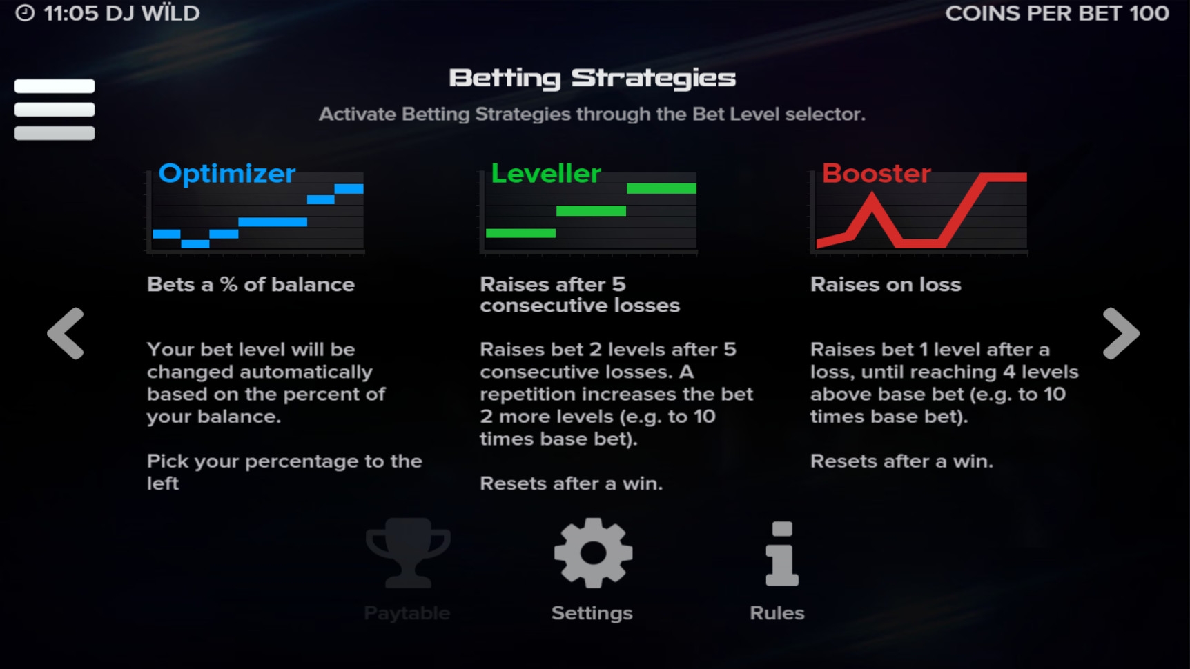 Обратите внимание на реализованную в DJ Wild возможность играть по разным системам ставок. Доступны четыре так называемых Betting Strategies. Если вы задействуете любую из них, размер ставки будет меняться по заданному алгоритму. Описание всех стратегий вы найдете в специальном разделе правил.